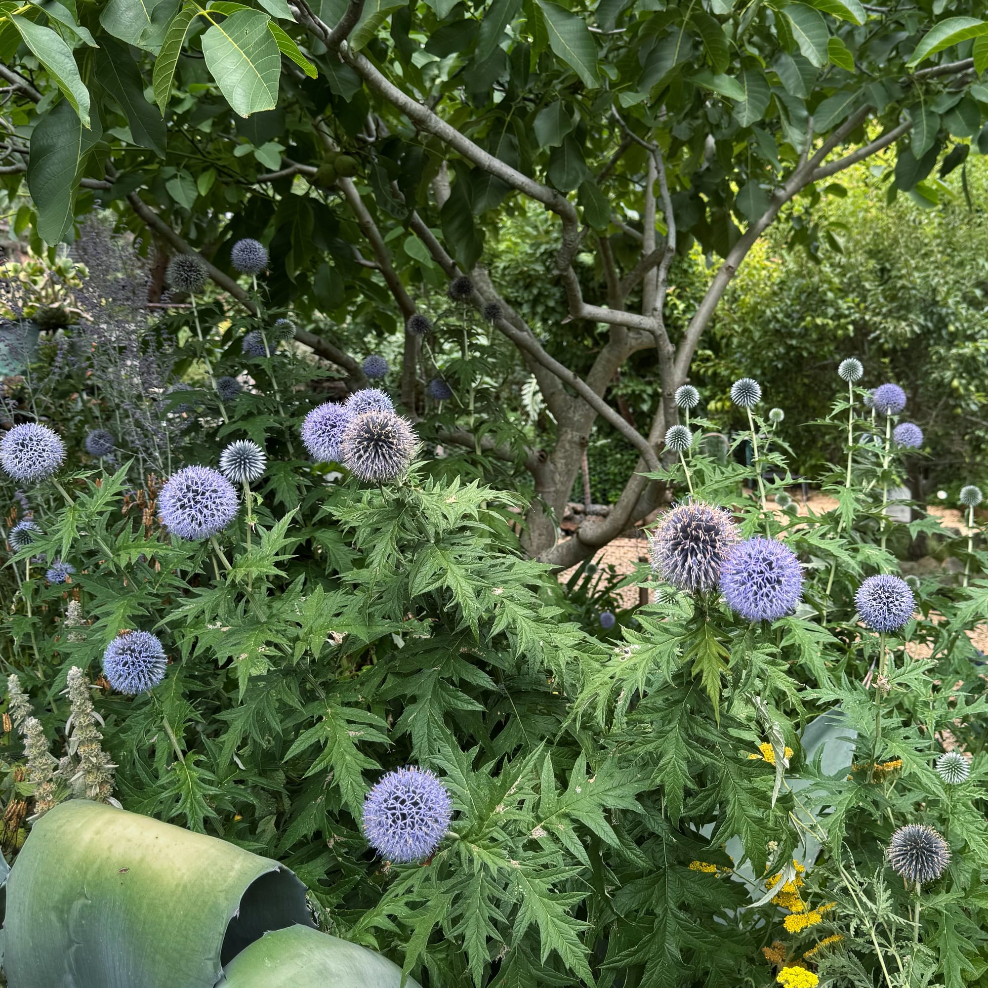 Its perfect blue orb-shaped flowers add a geometry to the garden when everything else has grown to exhausted leggy wisps. It looks stylish leaning against stone walls, and its long jagged arcs of foliage are just as interesting as the flowers.