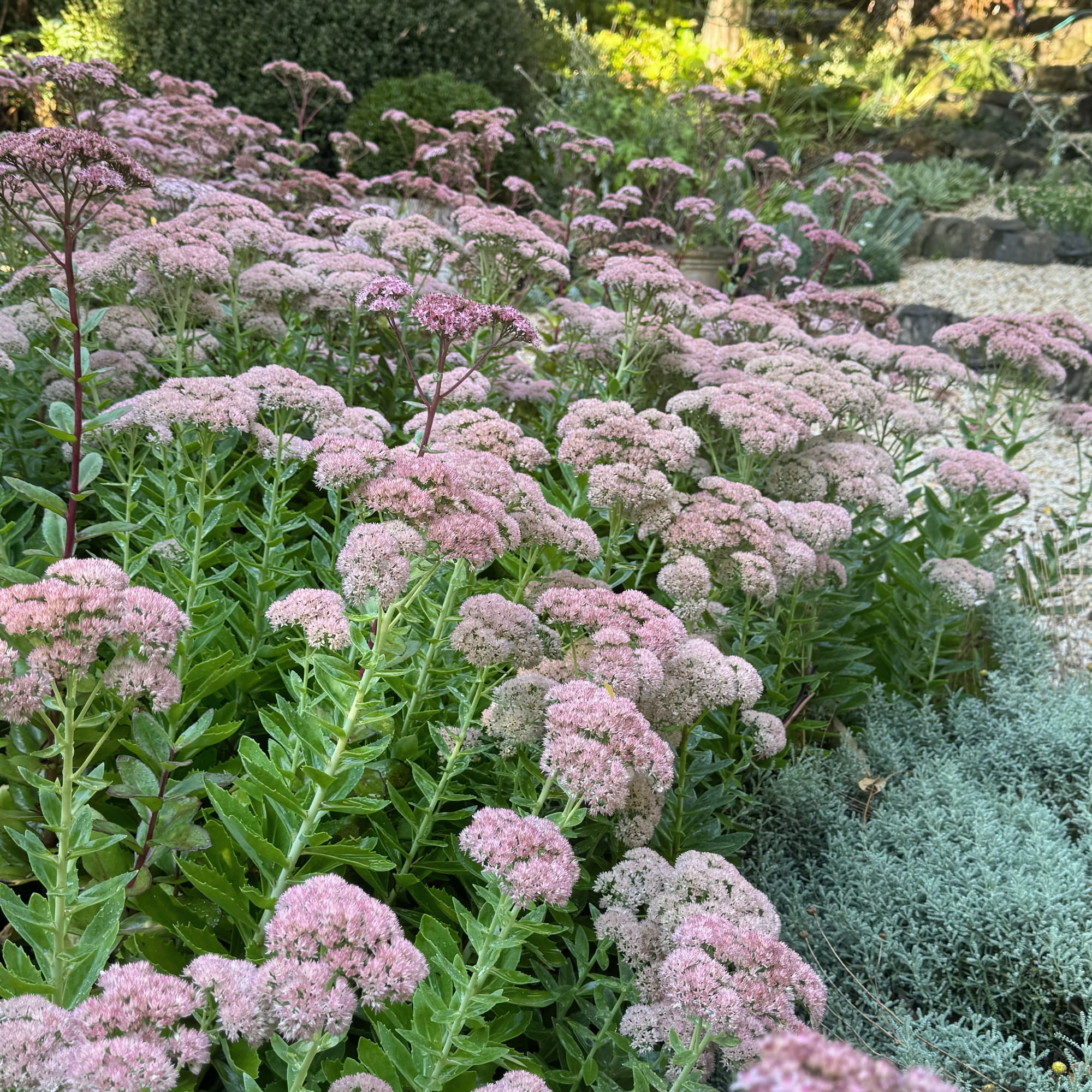 A garden triumph. Every stage of its growth is attractive. It’s a metamorphosis that begins with compact mounds of foliage, then pale green flower spikes blushing to pink, then intensifying to burgundy, then finally rust. During winter the dead flowers and stems are just as invaluable, giving the bare bones of the garden added interest.