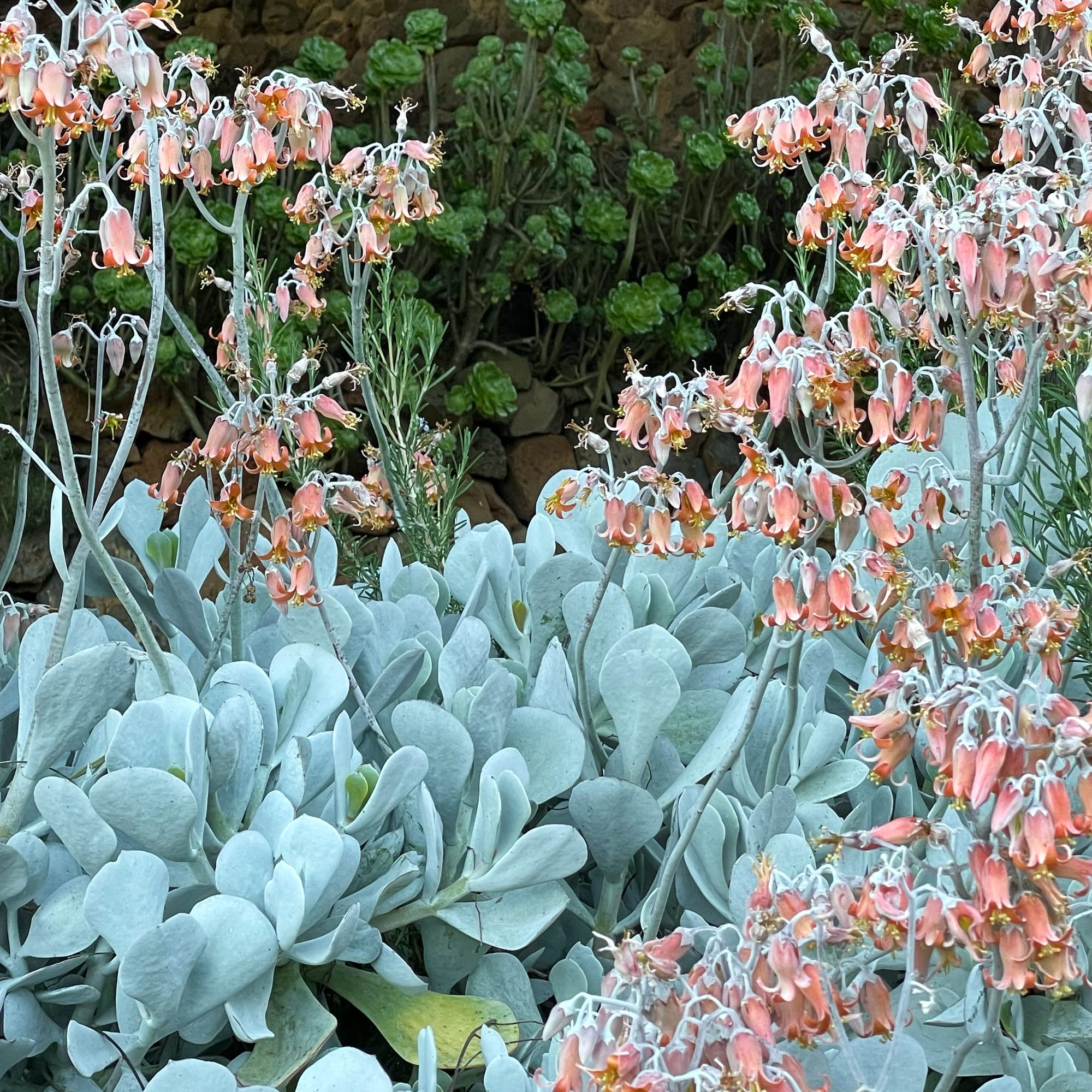 Apart from being timid of heavy frost, this drought-tolerant essential is wonderfully architectural and very dependable. Its robust and rubbery leaves are anchoring, especially the grey-leaved variety ‘Silver Dust’, which is “high fashion” alongside its flower spikes decorated with shy salmon bells.